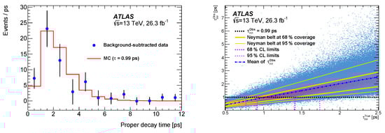 The third and final step consists of a binned- fit to the proper-decay time distribution extracted in the previous step. This distribution is considered in the interval of 0 to 12 ps and divided in twelve equal width bins. Pure signal proper-decay time simulated templates in the same interval and binning scheme corresponding to different values of are generated, and a -binned fit is performed with respect to background-subtracted data. The calculation takes both the statistical uncertainty on the weight-corrected MC and the Poissonian uncertainty in each data bin as expected from the predicted MC content for that bin into account. The template minimizing the corresponds to an observed lifetime of 1.07 ps. MC pseudo-experiments studies, generated for a lifetime of 1.624 ps (i.e., the SM predicted value), showed that the lifetime extraction procedure had a bias of 82 fs due to the low-statistics regime of the fit. This bias is found to be constant in the lifetime range considered in the analysis. Therefore, the quoted value for has been corrected for this effect. The statistical uncertainty on is instead extracted using an MC pseudo-experiments-based Neyman construction, yielding to a value of ps. Figure 2 shows the signal proper decay time distribution extracted from data superimposed with the MC template minimizing the distribution (left) and the MC pseudo-experiments-based Neyman construction used to estimate the statistical uncertainty of the measurement (right).