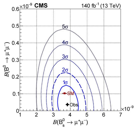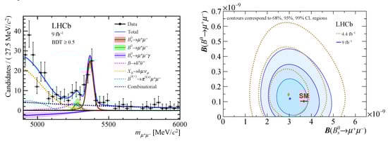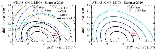 - CMS and LHCb Collaborations; Khachatryan, V.; Khachatryan, V.; Sirunyan, A.M.; Tumasyan, A.; Adam, W.; Bergauer, T.; Dragicevic, M.; Erö, J.; Friedl, M.; et al. Observation of the rare → μ+μ− decay from the combined analysis of CMS and LHCb data. Nature 2015, 522, 68–72. [Google Scholar] [CrossRef]