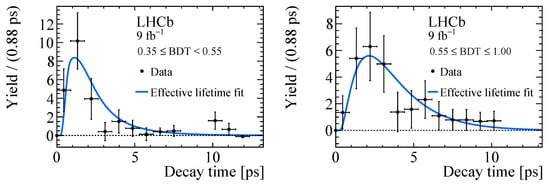 The background-subtracted decay-time distributions with the fit model used to determine the effective lifetime superimposed. The distributions in the low and high BDT regions are shown in the left and right plot, respectively. Figures from Ref. [34].