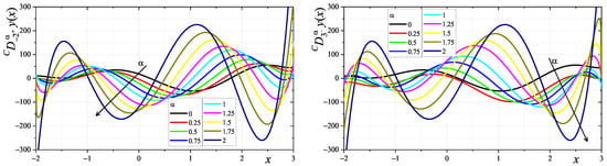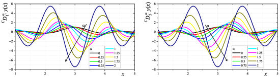 In Figure 1, the plots of the left- and right-sided fractional integrals and , (112) and (113), respectively, for , are shown. The cases for correspond to the plot of the function (i.e., ), and, e.g., for : , which is identical to the classical integration of the function in the interval . Also, it can be seen that, for , and hold. In Figure 2, the plots related to the fractional derivatives and are presented. As before, it can be noted that . On the other hand, for, e.g., , , and , occur. Moreover, for , and occur.