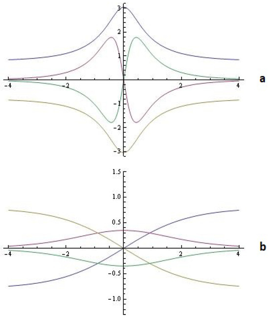 The nonlinear Equation (6): (a) for , , , , , has root with multiplicity two; (b) for , , , , , has no roots.