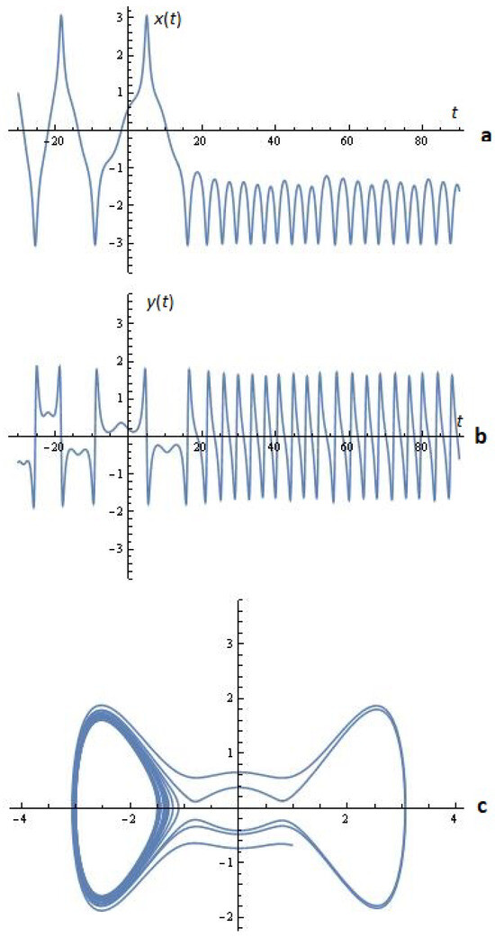 (a) x-time series; (b) y-time series; (c) phase space; (Example 3).