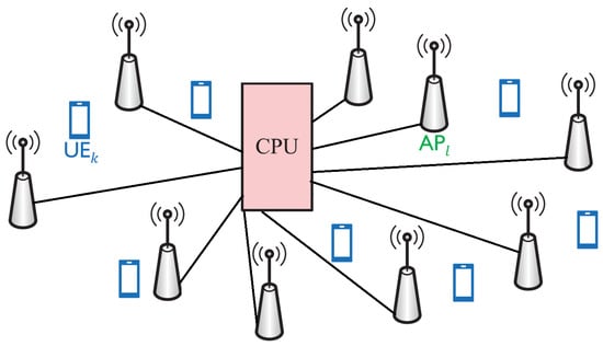 CF-M-MIMO has been recognized as a key facilitator for the advancement of 5G and subsequent generations of networks [19]. Its pivotal feature involves a multitude of distributed Access Points (APs) collaboratively catering to User Equipments (UEs) within a designated coverage area, eliminating the imposition of artificial cell boundaries [20,21]. In contrast to cell-based massive MIMO networks, CF-M-MIMO systems exhibit reduced SINR variation, enhanced interference management capabilities, and higher SINR through coherent transmission [21,22]. In a CF-M-MIMO network, a multitude of Access Points (APs) collectively serves a comparatively smaller number of UEs sharing the same time–frequency spectrum resource. Channel estimation, a critical factor influencing network performance, is typically performed during the uplink training phase by transmitting pilot signals [21]. Given the finite number of orthogonal pilots, there is pilot reuse among UEs, introducing the challenge of pilot contamination, which in turn leads to compromised channel estimation and performance decline [19,21]. The extensive macro-diversity gain introduced by the collective transmission and reception in CF-M-MIMO systems has attracted considerable attention in academic research [19]. Significantly, studies have revealed that CF-M-MIMO systems exhibit superior performance in %95-likely per-user spectral efficiency compared to small-cell systems. This advantage primarily stems from their effective joint interference cancellation capabilities [23]. CF-M-MIMO systems, which have collaborative signal processing, can reduce the effects of non-ideal factors in practice, such as channel aging and hardware impairments [24,25,26], by using their plentiful spatial degrees of freedom. This is different from traditional cellular networks. Furthermore, research findings indicate that the integrated power control strategy within CF-M-MIMO systems plays a pivotal role in optimizing wireless power transfer efficiency, presenting a notable advancement compared to conventional systems [27]. Moreover, using both centralized and distributed methods to detect joint activity in CF-M-MIMO systems reduces the chances of errors. This is backed up by real data and happens when the number of APs grows significantly [28]. Furthermore, a spectrum of joint optimization algorithms has been introduced for CF-M-MIMO systems to bolster system functionality. The algorithms aim to achieve various tasks such as balancing the load with less energy consumption [29], reducing the complexity of channel estimation and decoding [30], and establishing a scalable framework through AP scheduling [31]. Therefore, combining the signals from different sources is crucial and basic for making CF-M-MIMO systems work well. The main challenges in building a network infrastructure without cells are related to the high difficulty of processing signals and the large fronthaul needs for information exchange between APs [32,33]. Thus, a network architecture with low-capacity fronthaul links between the APs and the Central Processing Unit (CPU) is more desirable [33,34,35]. Scalability issues of different algorithms as the network grows have been investigated in recent research [21,22]. Effective power allocation is essential for reducing multi-user interference and enhancing network performance, as different UEs share the same time–frequency resource [36].