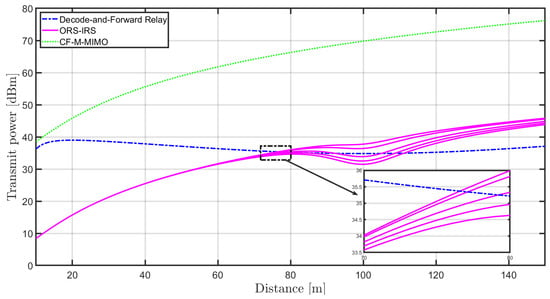 Figure 3 illustrates a comparison of the required transmit power to achieve target rates of R = 10 bit/s/Hz. The results are presented for three scenarios: CF-M-MIMO, DF relaying, and the proposed method ORS-IRS. The five different lines shown for ORS-IRS were created from top to bottom for N values of 100, 200, 500, 750, and 1000, respectively. Until a distance of approximately 76 m, the ORS-IRS scheme exhibits the lowest power requirement, while the CF-M-MIMO system necessitates the highest power at all locations. As the distance increases towards around 110 m, fluctuations in the required power are observed for the ORS-IRS scheme. However, beyond 110 m, the required power in the ORS-IRS scheme starts to increase. In contrast, the DF relaying scenario maintains stability throughout. The increase in the required power for ORS-IRS can be attributed to encountering higher Signal-to-Interference-plus-Noise Ratio (SINR) levels. In the ORS-IRS system, higher SINR conditions lead to an increase in the required power. The comparison reveals that IRS and DF relaying outperform the CF-M-MIMO case, with IRS becoming more competitive at higher rates, requiring minimum power consumption when the destination is in close proximity to the source and needing fewer elements to surpass the performance of relaying.