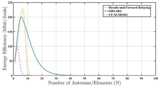 Within the realm of wireless communication systems, a study conducted in [56] has demonstrated that the incorporation of Intelligent Reflecting Surfaces (IRS) can significantly enhance energy efficiency. Drawing on this insight, the comparison of the proposed ORS-IRS method with CF-M-MIMO and DF relaying in terms of energy efficiency is depicted in Figure 4. While efficiency at N = 3 yields similar results in all three cases, both ORS-IRS and DF relaying exhibit similar increasing trends at values of N between 3 and 5. With the subsequent declines, it becomes evident that ORS-IRS saturates at larger values of N. The sustained energy efficiency after a certain value of N can be attributed to the transmission system reaching a specific capacity or limit. Beyond this point, the addition of more antennas or elements may have a limited or negligible impact on energy efficiency. In the design of transmission systems, particularly in wireless communication systems, an initial increase in energy efficiency is often achievable with a greater number of antennas or elements. This augmentation provides enhanced capacity or diversity. However, the advantages of integrating extra antennas or elements begin to diminish after reaching a certain threshold.