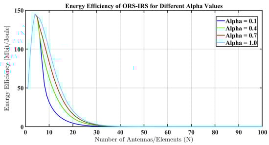Energy efficiency of IRS for different alpha values.