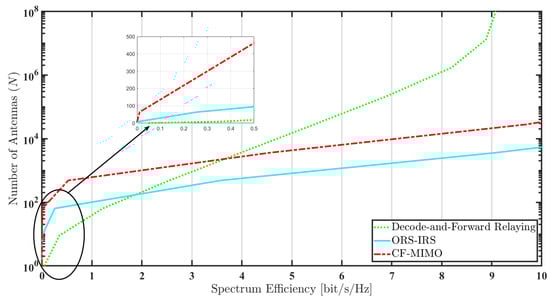 Figure 6 illustrates the antenna requirements for all three methodologies to achieve a specific spectrum efficiency. Upon initial analysis of the graphical outcomes, it becomes evident that, for a spectrum efficiency above zero, the CF-M-MIMO system necessitates an approximate sevenfold increase in the number of antennas compared to the ORS-IRS configuration. Notably, DF relaying exhibits the lowest minimal antenna requirement. Post this threshold, no sharp spikes in antenna requirements are observed. For spectrum efficiencies exceeding approximately 3.5 bit/s/Hz, the DF relaying scheme continues to demand an escalation in antenna count. However, both CF-M-MIMO and ORS-IRS approaches manifest a trend moving closer to horizontal. In the scenario involving 3600 antennas, CF-M-MIMO and DF relaying showcase comparable spectrum efficiencies, albeit slightly superior. In contrast, the spectrum efficiency for ORS-IRS surpasses that of the others by a factor of about 2–3.