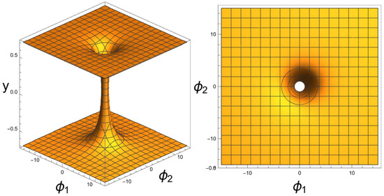 Left figure depicts a three-dimensional plot of the asymmetric element of the metric tensor in the limit, calculated in the nucleon ground state for the values of parameters and . Right figure shows a two-dimensional projection of the sub-manifold , where it is clearly seen that it has a singularity characterized by a Betti number of 1.