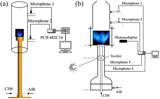 Schematic diagram of combustion experimental devices using (a) a Rijke tube and laminar flow burner, or (b) a swirl burner.