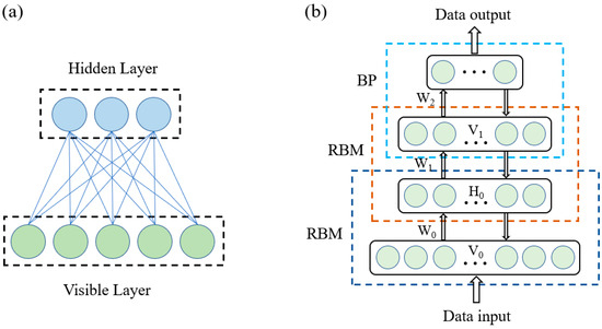 The DBN (deep belief network) architecture is a deep neural network composed of several layers of restricted Boltzmann machines (RBMs) and one layer of backpropagation (BP) [24]. The structure of the DBN is shown in Figure 3b. RBMs consist of only two layers of neurons: visible and hidden layers. The units between the two layers are interconnected, while there are no connections within each layer. The structure of an RBM is illustrated in Figure 3a.