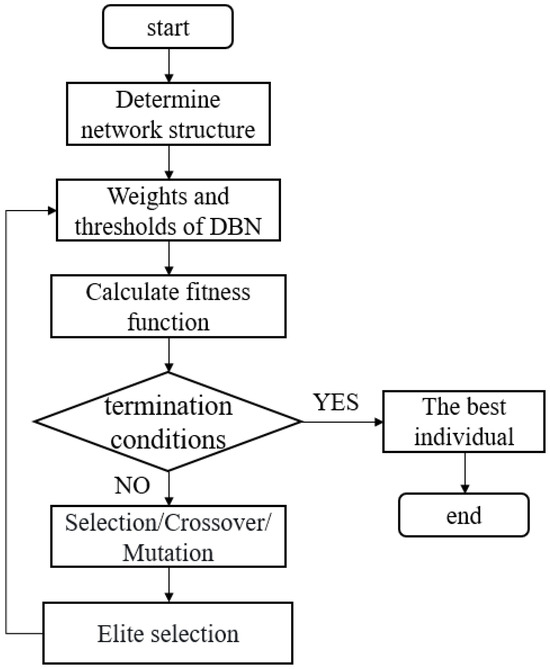 A genetic algorithm (GA) is a computational optimization technique inspired by natural selection [25,26,27]. Mimicking biological evolution, GAs iteratively evolve a population of potential solutions by selecting, recombining, and mutating individuals based on their fitness. Solutions that better address a problem survive and propagate, creating diverse offspring. This process continues until an optimal or satisfactory solution is found. Leveraging a genetic algorithm for optimizing the parameters of a DBN mitigates the challenge of encountering local optima resulting from random initialization. This approach enhances the predictive performance of the DBN network. The optimization process is visually depicted in Figure 4.