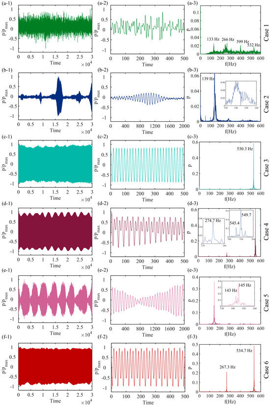 Time and frequency domain diagrams of six combustion oscillation states: (a-1–f-1) show the time-domain plots, (a-2–f-2) show the local details of the time-domain plots, and (a-3–f-3) show the frequency-domain plots.