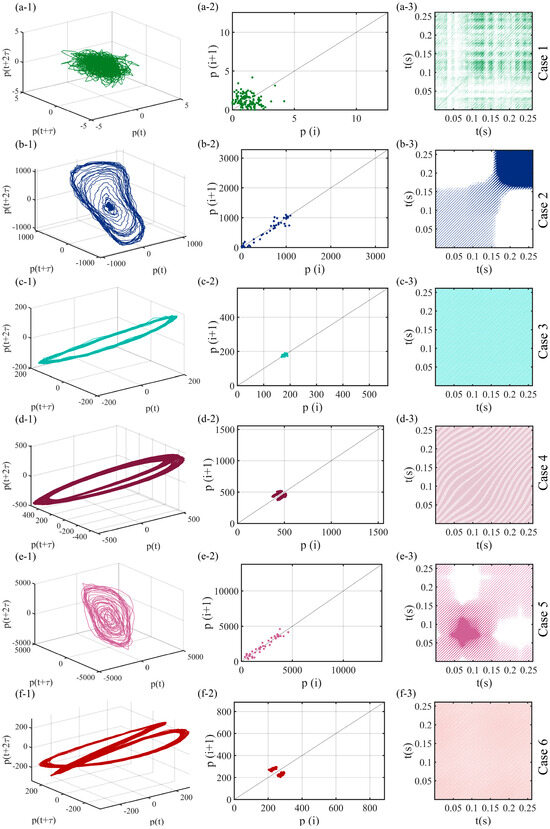 A nonlinear analysis of six distinct combustion oscillation states: (a-1–f-1) illustrate the 3D phase plots, (a-2–f-2) showcase the Poincaré sections, and (a-3–f-3) display the recurrence plots.