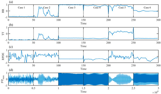 Diverse quantization parameters capture various details of oscillation states within recursive graphs from distinct perspectives. Figure 7 elucidates the quantification outcomes derived from three quantitative methods—RR, TT, and RPDE—in diverse oscillation states. In Case 1, representing a stable combustion state, both RR and TT values maintain a proximity to −1, with subtle fluctuations over time. Meanwhile, RPDE values exhibit significant variation within the range of −1 to 1, lacking a discernible pattern. Shifting to Case 2, emblematic of an intermittent oscillation state, the transition between stable combustion and oscillation states induces noticeable changes in RR. It increases from −1 in the stable state to approximately 0.5 during oscillation, with fluctuating values around 0.5 due to irregular oscillations. TT values follow a similar trend to RR, stabilizing around 0 during oscillation, while RPDE values become more regular, converging toward stability. In Case 3, representing a limit cycle oscillation state, RR, TT, and RPDE converge to a stable value, reflecting the strong periodicity evident in the sound pressure time series during limit cycle oscillation. Case 4, portraying differential frequency oscillation, witnesses stable RR, TT, and RPDE values closely correlated with the amplitude of the sound pressure time series. Case 5, characterized by beat oscillation, exhibits large variations in amplitude over time, resulting in substantial fluctuations in RR, TT, and RPDE values. Lastly, in Case 6, representing period-2 oscillation, the TT value maintains relative constancy, while RR and RPDE values display systematic variations in correspondence with the amplitude of the sound pressure time series. In summary, the comprehensive analysis of RR, TT, and RPDE as quantification parameters underscores their efficacy in effectively distinguishing between different oscillation states.
