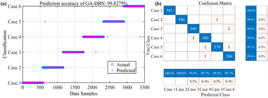 Figure 8 illustrates the classification outcomes of GA-DBN, with Figure 8a showcasing the classification results for 3486 sample data. Figure 8b presents the confusion matrix associated with these classification results. Examining Figure 8a, it is evident that only six data samples were misclassified, yielding a remarkable prediction accuracy of 99.83% for this experiment. Figure 8b offers an in-depth analysis of the classification scenario using the confusion matrix. All 581 samples in Case 1 were accurately predicted, with no instances of other combustion states being erroneously classified as Case 1. For Case 2, out of 581 samples, 580 were correctly predicted, and only 1 sample was inaccurately classified as Case 5. Further analysis suggests that Case 2 exhibits intermittent oscillation, characterized by significant amplitude variations over time, resembling the beating feature of Case 5. When the time window of the time series is short, it might fail to capture the complete characteristics of intermittent oscillation, leading to misclassification as beating oscillation. One sample in Case 4 was misclassified as Case 3, with no other combustion states being erroneously classified as Case 4. In Case 3, out of 581 samples, 580 were correctly predicted, while 1 sample was mistakenly classified as Case 6. This misclassification can be attributed to the relatively similar features of these two combustion states. For Case 5, 579 out of 581 samples were accurately predicted, with 1 sample each being misclassified as Case 6 and Case 4. In Case 6, 580 out of 581 samples were correctly predicted, with 1 sample mistakenly classified as Case 4. In summary, it was observed that Case 3, Case 4, and Case 6 are more susceptible to misclassification due to their regular oscillatory nature.