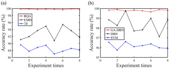 As shown in Figure 9, Figure 9a displays the comparative results of feature extraction algorithms. Figure 9a illustrates the performance of three distinct feature extraction algorithms: recursive quantification analysis (RQA): This method relies on recursive graph analysis to derive thirteen feature parameters representing different combustion states. Energy entropy of empirical mode decomposition (EMD): This approach leverages the energy entropy derived from EMD to capture intricate details of combustion instability dynamics. Time-domain and frequency-domain features (TF): Traditional time-domain and frequency-domain features are extracted to provide a baseline for comparison. In Figure 9a, the accuracy of the RQA method remains consistently near 100%, significantly outperforming the other two methods. This robust and reliable performance showcases the effectiveness of the RQA algorithm in accurately extracting features related to thermoacoustic combustion instability, making it a standout performer in comparison to the other two methods. The EMD method performs relatively well, while the TF method shows the lowest performance. The time-domain and frequency-domain features (TF) method lags behind, indicating limitations in accurately representing the intricate patterns inherent in thermoacoustic combustion instability. Additionally, across eight experiments, both the EMD and TF methods exhibited significant fluctuations in prediction accuracy, whereas the RQA method consistently achieved desirable prediction results in each trial.