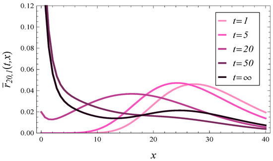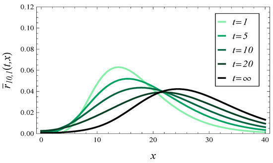 In these pairs of figures, we may notice a very different behavior of the response time. Specifically, in Figure 4 and Figure 5, the probability mass tends to concentrate around as time passes. Conversely, in Figure 6 and Figure 7, the probability mass concentrates around as time goes on.