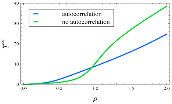 The effect of autocorrelation on the response time may be seen further in Figure 8. In this figure, the steady-state mean response time is shown depending on load, which varies from 0 to 2. Specifically, the blue curve reflects the mean response time for autocorrelated arrivals (69)–(72), while the green curve reflects the response time for uncorrelated ones, , .