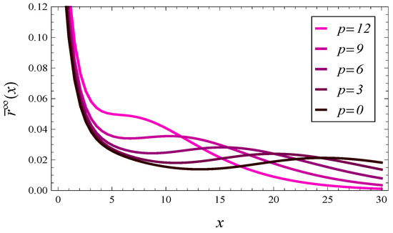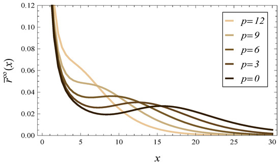 In Figure 9 and Figure 10, we can see the density of the response time in steady state for 5 values of parameter p. Figure 9 covers the case , while Figure 10 covers the case . In both figures, autocorrelated arrivals (69)–(72) are used.