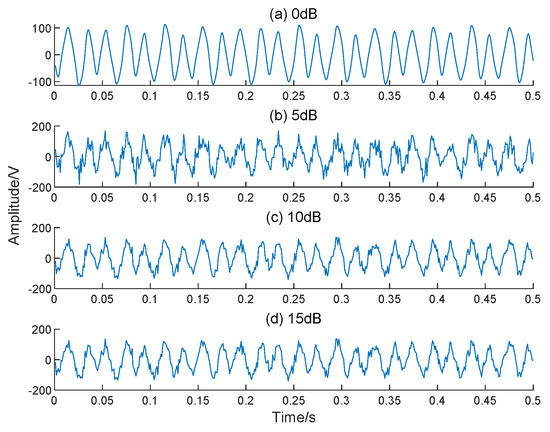 In this paper, SNR and RMSE are used as evaluation indexes. The SNR reflects the size of noise content in a signal. The denoising effect is better with the increase in SNR. The RMSE reflects the restoration degree of the denoised signal. The smaller the RMSE, the smaller the deviation between the denoised signal and the noiseless original signal. In order to obtain accurate identification results, SNR is usually required to be greater than 20 dB.