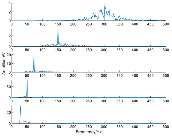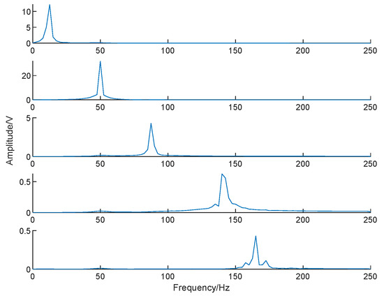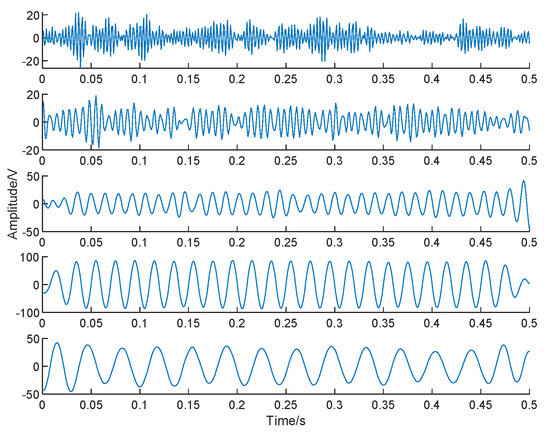 5], which can ensure the accuracy of VMD decomposition results. The position interval of punishment factor is (1000, 8000), with other parameters unchanged. The optimal position of the particle is (5, 6819.1); it was substituted into the VMD algorithm. The decomposition results are shown in