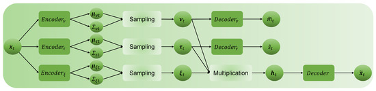 FED employs three encoders to model the three probabilistic components of the latent variables, including trend (return), dispersion (standard deviation), and residual. Similar to reference [14], the reparameterization trick was used. Figure 1 illustrates the general framework of FED.