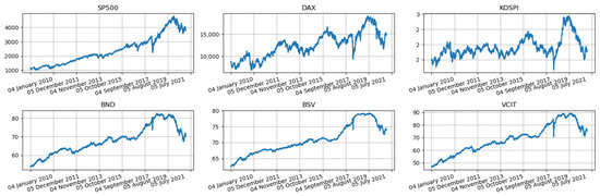FED2Port aims to allocate the total investment into two classes: high-risk and low-risk assets. This paper considers three stock indices and three bond funds (Table 1) in the experiment. The daily data from January 2010 to December 2022 (https://finance.yahoo.com/ accessed on 1 October 2023) were included. To initialize models, they were trained using the five-year data from January 2010 to December 2014 for each dataset. Then, we tested the model using eight-year data, from January 2015 to December 2022.