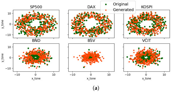 FED was compared with the most recent time series data generation models, namely TimeGAN [16] and RTSGAN [17]. TimeGAN and RTSGAN are designed to generate synthetic data that closely resembles real-world time series data. However, neither of these models addresses the generation of nonstationary financial time series data. FED leverages decomposition techniques to break down financial time series data into distinct components, such as trend, dispersion, and residual. By decomposing the data in this manner, FED can capture the various underlying factors influencing the trends and fluctuations in the market, leading to a more accurate representation of real-world financial time series data. The t-SNE plots of original versus generated data were plotted in Figure 6. The results indicated that FED produces synthetic data that closely match the original distribution of the data, suggesting that FED is more effective in capturing the underlying structure and characteristics of financial time series data compared to other models.