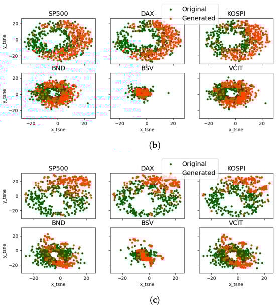 t-SNE plots for original versus generated data. (a) Financial time series decomposition-based variational encoder-decoder (FED). (b) Time-series generative adversarial net (TimeGAN). (c) Real-world time series GAN (RTSGAN).