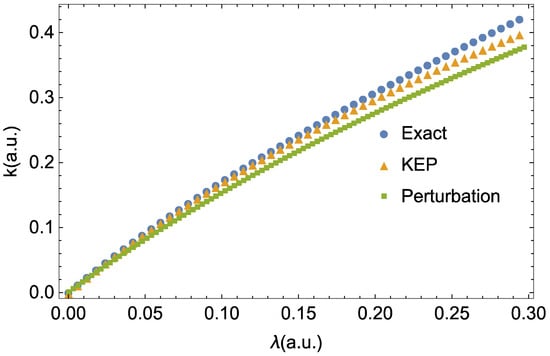 Comparison of the exact, KEP and perturbation method of wave numbers versus the values for the double zero-range potential, where the strengths of interaction are the same. The (blue) circle, (orange) triangle and (green) square represent the exact and the KEP wave numbers, respectively. The x-axis is the value in the atomic unit, and the y-axis is the wave number in the atomic unit, and here, .