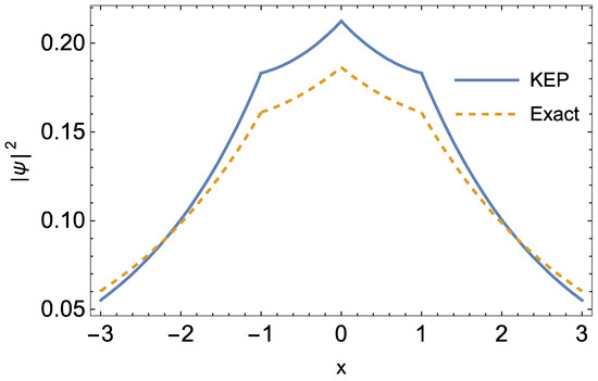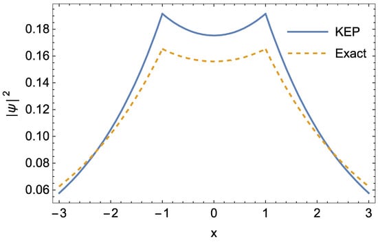 Figure 1 presents a comparative analysis of the exact wave numbers and those obtained via the kinetic energy partition (KEP) method against the strength of a zero-range potential, denoted by λ. This comparison elucidates the correlation between precise quantum mechanical calculations and the KEP approach on the one hand and the perturbation method on the other as λ varies. Based on the description and the visual representation provided in Figure 1, it can be observed that when the strength of the zero-range potential, λ, is small, the wave numbers calculated using the kinetic energy partitioning (KEP) method align closely with those derived from exact quantum mechanical solutions. This indicates a high degree of accuracy of the KEP method in the regime of weak potentials. The data points, represented by blue dots, are nearly indistinguishable from the exact solution, signifying strong agreement. The results of using the first-order perturbation method, by treating one delta potential as perturbation, are represented by green squares. The first-order perturbation method shows reasonable agreement with the exact solutions at lower values of λ; yet, as λ increases, the perturbation approximations begin to diverge, suggesting its limitations in the context of stronger potentials. However, as λ increases, the potential becomes stronger, and while the general trend of the KEP method continues to follow the exact solutions, there is a slight divergence noted, which might be indicative of the limits of KEP approximation under the conditions of strong interactions. The KEP method significantly deviates from the exact solution, emphasizing the need for careful application of the KEP method at certain ranges of λ. The overall linear trend suggests a proportional relationship between the wave numbers and the strength of the potential across a wide range of λ values. Figure 2 shows the wave function profiles obtained with the kinetic energy partitioning (KEP) method and exact calculations within the domain . The graph features a dual-peak structure (that is, the discontinuity in the first derivatives of the wave function), which reflects the divergent behavior of the zero-range potential. The KEP method demonstrates high accuracy in the wave function form, as evidenced by its close approximation to the exact wave function.