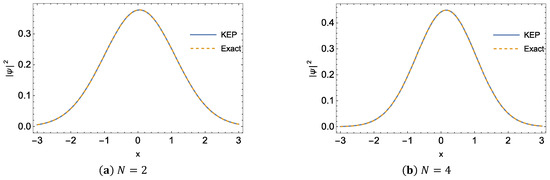 and are represented as and , respectively. We appreciate Dr. Francisco M. Fernaández [14] for pointing out several simplifications in our previous studies [4], giving many useful suggestions and indicating the exact solutions of Equation (58). Table 1 shows the high accuracy of using the KEP method in a system with many quantum harmonic oscillator interactions. The numerical results with five-digit decimals are compared with the exact eigenvalues. The KEP method yields an excellent agreement with the exact energies in Equation (58). Figure 5 plots the KEP wave function square with different values in Equation (57) as compared to the exact probability density. This illustrates that the KEP eigenfunctions are close to the exact eigenfunction in the case of many quantum harmonic interactions.