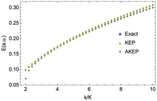 Comparison of the exact energy solutions, the KEP and AKEP solutions for the ratio of the spring constants. Here, we utilize the atomic units and .