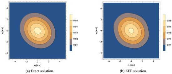 In Equation (84), we can see that the ratio of 2 is a critical point of the exact solution, where the repulsive potential is equivalent to the attractive potential, and the system starts to become unstable. We see that both the KEP and the AKEP results exhibit quite large errors near the critical point, with others being less than 3%. In Figure 6, we plot the exact, KEP and AKEP energies with different k/K ratios. Clearly, the KEP method can be used for a very wide range of ratios. The exact wave function is compared with the KEP solution, as shown in Figure 7. We see an overall agreement in the contour plots, thus demonstrating the feasibility of using the KEP method in modeling the wave functions.