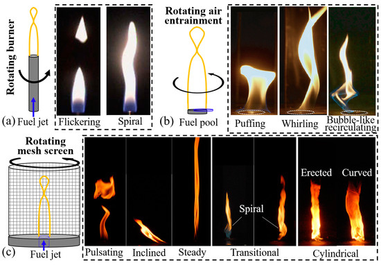 Various patterns of flickering flames or puffing fires with swirl: (a) the rotating burner [53], (b) the rotating air entrainment due to arranged vanes [47], and (c) the rotating mesh screen [54].