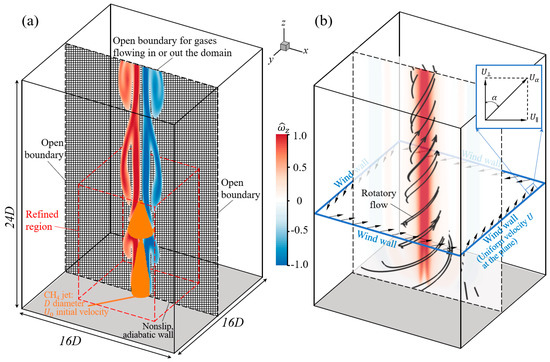 (a) Schematic of the present simulations including the domain, mesh, and boundaries. (b) The swirling flow is adjusted by the four wind walls with inlet velocity , where is the included angle between velocity components and The contour of the Y−Z plane shows the vertical component of vorticity.