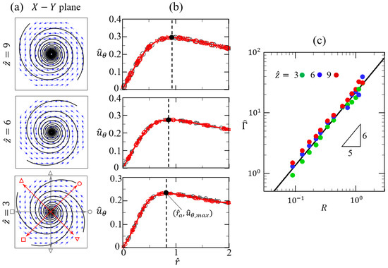 Figure 3c shows that the vortical strengths, defined by the dimensionless circulation , are enhanced with increasing when is fixed at . In addition, the scaling correlation of is valid for a quite wide vertical range up to . Figure S2 shows that the maximum azimuthal velocity is proportional to and the radial location of vortex cores generated at different is approximately a constant. Therefore, is proportional to the non-dimensional circulation imposed by the rotatory flow, which is evaluated as . It should be noted that the angular velocity of the swirling flow increases with and is estimated to .