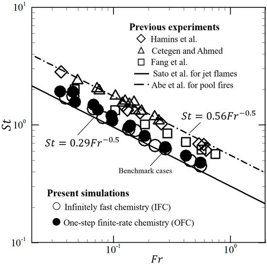 Previous studies [24,25,26,27,28,29] found that the flickering of flame is a buoyancy-dominated flow phenomenon, which is relatively insensitive to other flame parameters. As a result, the flicker frequency is proportional to , where is the gravity and is the diameter of jet nozzle or pool, and the proportionality factor slightly varies among many fuels [25]. This correlation led to the dimensionless scaling law, , where is the Strouhal number and is the Froude number. By directly calculating the non-dimensional circulation of a toroidal vortex within a periodic process of flame flicker, Xia and Zhang [30] obtained