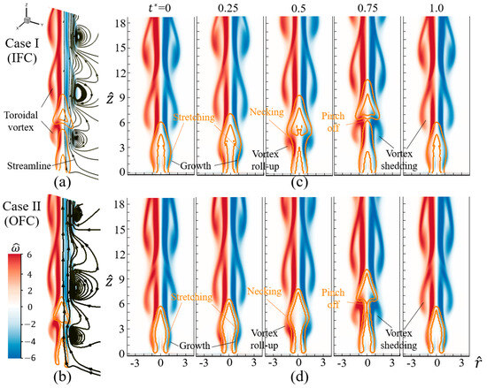 The contour of vorticity of flickering buoyant diffusion flames for the benchmark cases ( 0.165 m/s, = 100, = 0.28, and no swirling flow) in Figure 2: (a) Case I (IFC) and (b) Case II (OFC). The flame is represented by the orange isoline of heat release. The streamlines are plotted around the flame. (c,d) The time-varying evolution of flames and vortices in the benchmark cases.