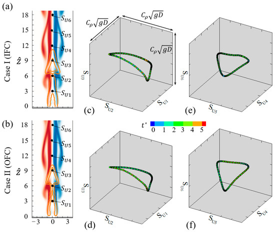 The phase portraits of flickering buoyant diffusion flames in Case I and Case II are shown in Figure 6. It is seen that each case has two phase trajectories, which are plotted by the axial components of velocities at three consecutive streamwise locations (i.e., three upstream locations and three downstream locations) in Figure 6a,b. During five periodic flickering processes, the upstream and downstream phase portraits for a flickering flame present the same closed ring shape, as shown in Figure 6c–f. Most remarkably, the nearly identical portraits in the phase space of Case I and Case II indicate that the chemistry has negligible effects on the flame flicker.