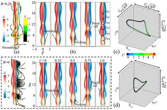 Compared with the above benchmark cases of , a similar evolution of the toroidal vortex for the case of = 0.26 and is shown in Figure 7. The flame’s stretching, necking, and pinch-off processes still correspond to the vortex formation, vortex growth, and vortex shedding, respectively. Besides, Figure 7c,d shows that the phase portraits are still a closed ring shape, which means the external swirling flow does not break the topological structure of the dynamical system.