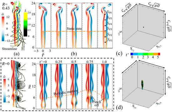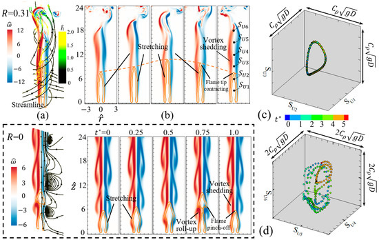 As increases up to 0.31 and is fixed at , the diffusion flame is not pinched off anymore, and its top oscillates up and down at a frequency of 13.1 Hz, which is identical to the frequency of vortex shedding, as shown in Figure 9. Compared with the benchmark case of = 0, the circumferential motion of the ambient air is significant, as indicated by the very high helicity density in flame, and the shear layers are highly stretched so that the roll-up of the vortex vanishes. Remarkably, the vortex shedding occurs near the top of the flame. The flame oscillating mode is similar to the “tip flickering” phenomena without any swirl, in which no flame separation occurs and the top is merely oscillating or elongating periodically. Sato et al. [11,27] reported that the tip flickering of flame appears under high fuel jet velocity conditions (), but the bulk flickering (called the flickering int the study) corresponds to the low fuel jet velocity (). This indicates that the external swirling flow has an equivalent influence with the increase of the inlet velocity and can restrain the flame from being separated, namely the occurrence of the (bulk) flickering. In addition, Figure 9c,d shows that phase portraits of oscillating flame vary largely, as the downstream trajectory becomes a distinct disorder in a bigger range while the upstream is a smaller closed ring. The shear layer denoted by the vorticity contour presents that the upstream is compact, but the downstream is unstable and the vortex develops into fragments.