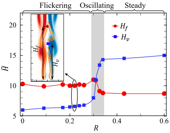 To facilitate the quantitative comparison between the vortex shedding and the change in flame height, we plot in Figure 11 the vertical position of the shedding vortex and the maximum flame height at the fixed but different . The change in the vortex shedding-off has three regimes: within (weak swirling flow regime), the buoyant diffusion flames retain the flicker (flickering mode) and gradually increases with ; for , increases rapidly and the pinch-off of flames is suppressed (oscillating mode); for , remains almost constant and the flames become steady (steady mode). Beyond the critical value of about 0.31, the flame flicker is suppressed by the strong swirl. Meanwhile, is nearly a constant between 9 and 10, with a slight decrease for . These three regions, corresponding to the small, intermediate, and large , correlate with the three flame modes illustrated above: the flickering flame, the oscillating flame, and the steady flame, respectively.