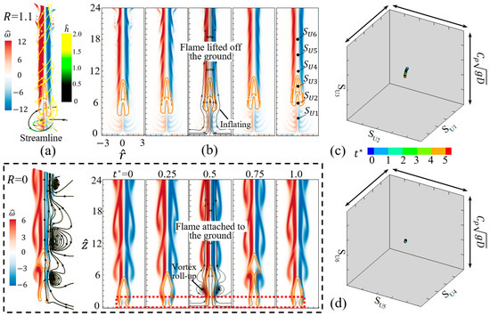 As shown in Figure 12a, the streamlines twine around the flame and have a higher at smaller . Additionally, the vorticity contour shows that the shear layers intrude into the central region and form a fishbone-like structure. Compared with the benchmark case of , Figure 12b shows that the flame in the case of and is stable but has no oscillation at all. The strongly swirling flow results in a corner-like flow near the fuel inlet instead of the vortex roll-up induced by the buoyancy in the benchmark flickering flame. The inflating flow with radially outward streamlines is caused by the turning of the incoming flow in the bottom boundary layer. Figure 12c,d shows the nearly motionless phase trajectories of the lifted flame, as the upstream portrait shows a slight change and the downstream one is almost unchanged.
