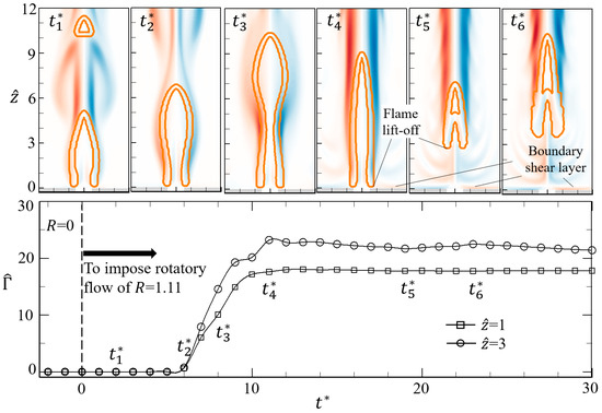 The variation of circulation with time during the lift-off formation from the attached flame. The circulation is defined as along the closed circle with the radius . The two lines represent the cross-section at and 3, respectively. Six instantaneous snapshots of flame and vorticity are included.