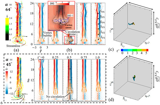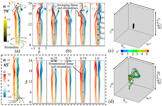 Vortex bubble of the buoyant diffusion flame ( = 100, = 0.28) in the swirling flow with and . (a) the flow around the flame, (b) the time-varying evolution of the flame, (c,d) the phase portrait in the cubic space plotted by six velocity components 1, 2, 3, 4, 5, and 6 at 3, 6, 9, 12, 15, and 18, respectively, along the central axis. All phase spaces have the same range of . In the dotted rectangle, the lifted flame at and α = 45° is shown to facilitate comparison.