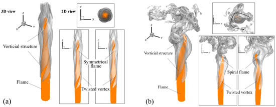 The three-dimensional view and their three-view drawings of (a) the oscillating flame () and (b) the spiral flame () corresponding to Figure 14, respectively. The flame is represented by the orange iso-surface of heat release. The vorticial structure is denoted by the grey iso-surface of vorticity.