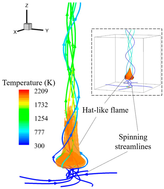 Comparison of the flame with vortex bubble and the simulated blue whirl (insert figure) [73]. The streamlines are colored by the temperature and the flame is plotted by the iso-surface of the heat release rate at 1 MW/m3.