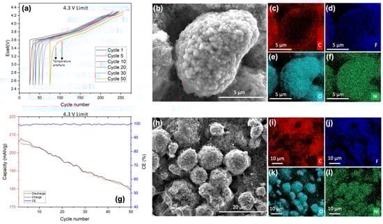 Figure 1. (a) Potential vs. capacity electrochemical curve of cycled NMC 811 at an upper high voltage of 4.3 V. (b) Secondary electron (SE) image of NMC 811 single secondary particles in the cathode sheet after cleaning (4.3 V-limit cell). EDX analysis for elemental identification of (c) carbon, (d) fluorine, (e) oxygen, and (f) nickel. (g) Charge and discharge lost and CE in the function of the number of cycles on the NMC 811 coin cell. (h) Secondary electron (SE) image of NMC 811 secondary particles in the cathode sheet after cleaning (4.3 V-limit cell). EDX analysis for elemental identification of (i) carbon, (j) fluorine, (k) oxygen, and (l) nickel.