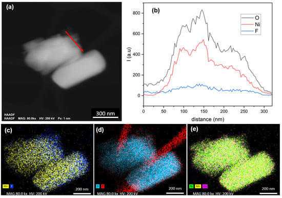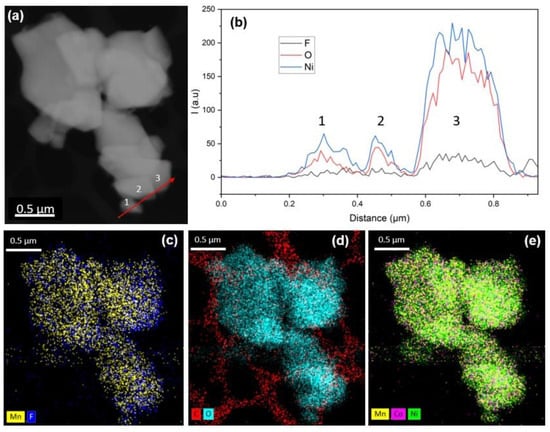 Figure 5. The 4.5 V sample: STEM-EDX analysis for primary particles. (a) HAADF image. (b) Line profile of the selection area (red arrow (a)), featuring the nickel, oxygen, and fluorine presence over it. (c) Color overlay featuring fluorine and manganese over particles for LiF observation. (d) Color overlay featuring carbon and oxygen for carbonates’ observation. (e) Color overlay featuring nickel, manganese, and cobalt (NMC 811).